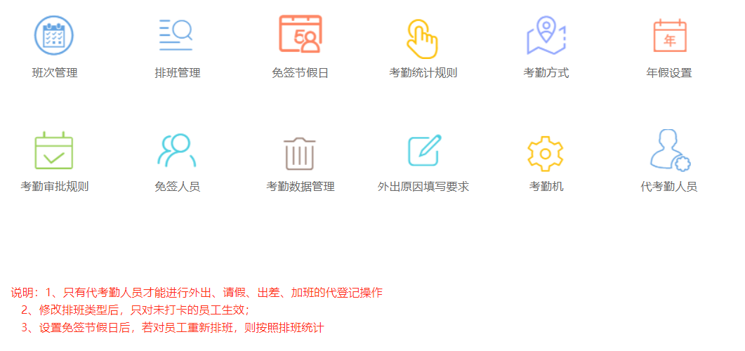 考勤设置有:班次管理、排班管理、免签节假日、考勤统计规则、考勤方式、年假设置、考勤审批规则、免签人员、考勤数据管理、外出原因填写要求、考勤机、代考勤人员。12个功能模块。