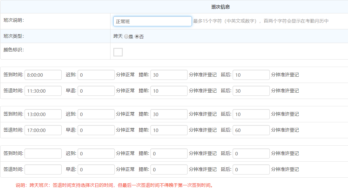 用于设置不同的班次时间、打卡时间范围、迟到与早退的时间范围,班次类别可设置是否跨天但每一个班次的总时间跨度不能超过24小时。