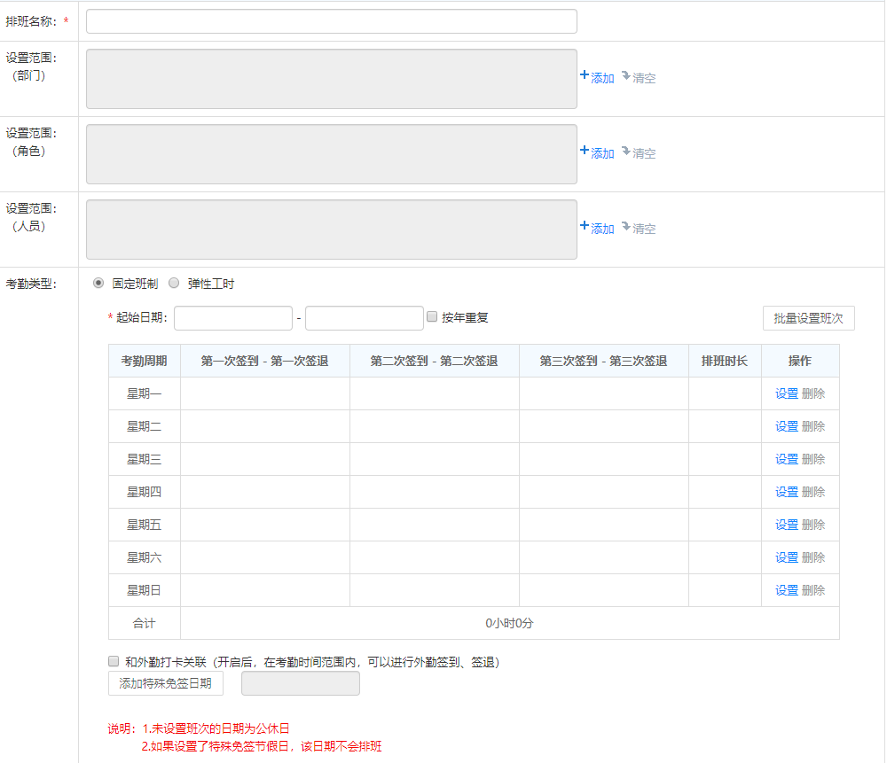 (1)固定班制可根据起止时间设置每周不同班次,可设置特殊免签节假日与外勤打卡关联,当勾选外勤打卡关联时,当开启了移动考勤、不在考勤范围内且在考勤时间范围内,外勤打卡时间可同步到正常上下班打卡时间