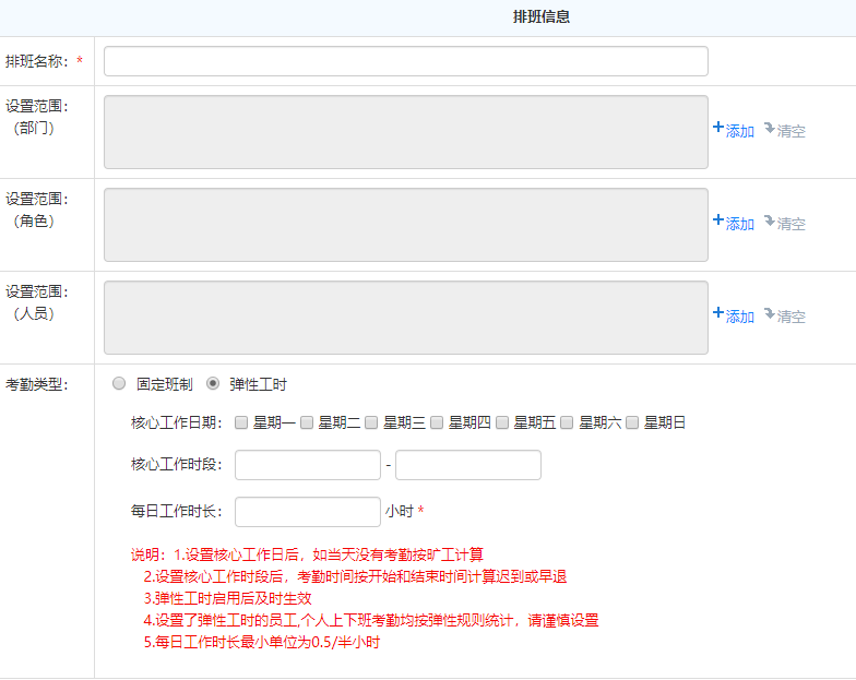 (2)弹性工时可设置核心工作日期、核心工作时段、每日工作时长