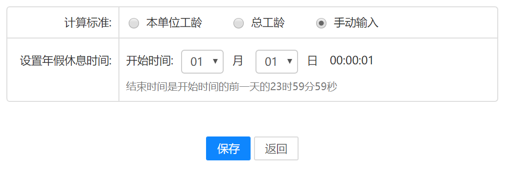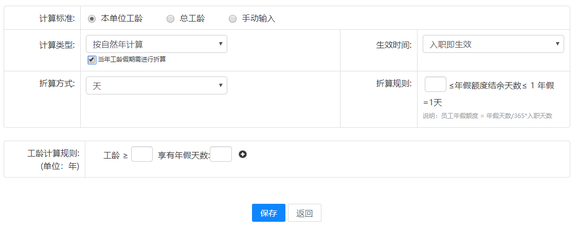 年假设置分为三种方式:本单位工龄、总工龄、手动输入。