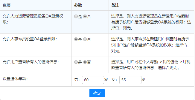 其他设置中,可以设置退休年龄以及人力资源管理员和人事专员能否设置OA登录权限,这是人力资源管理中OA登录权限的分散管理。