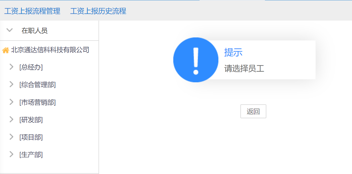 工资历史流程中,显示以前的工资流程,用户点击“查阅”后,可以进入查阅界面,在界面的左侧选择要查阅的员工和部门即可查看某员工和某部门的详细的工资项目。