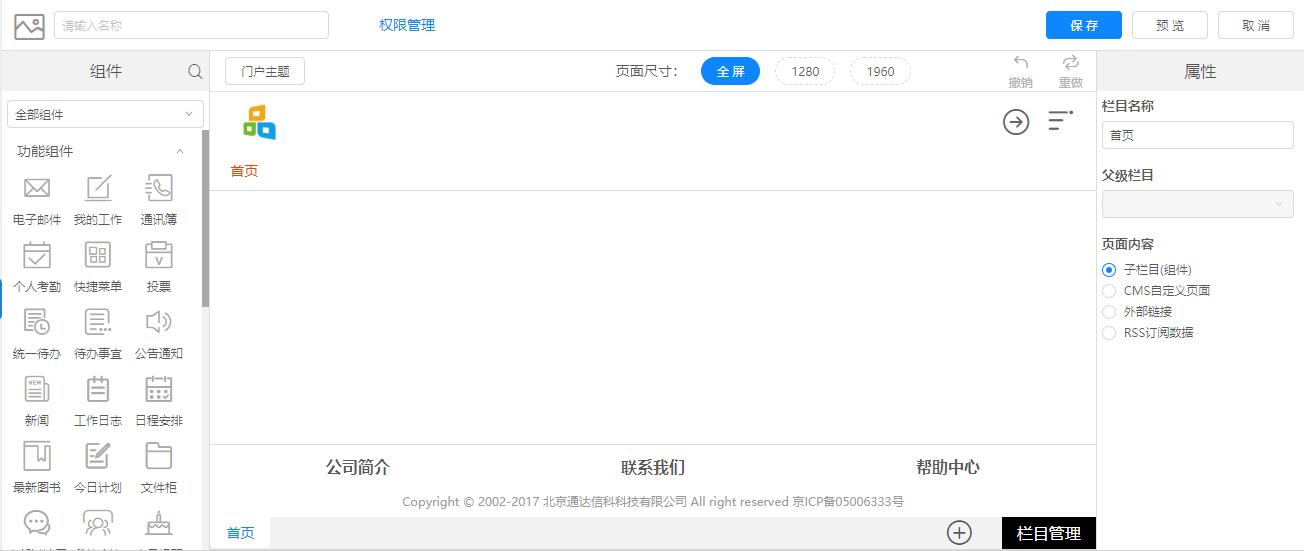 点击左上角【新建门户】按钮可进入门户设计器,门户设计器可基于栏目关系,结合组件的运用,使用拖拽的方式来完成门户的设计工作。
