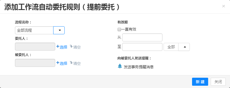 委托规则用于提前委托,选择需要委托的流程,指定委托人与被委托人并设定好需要委托工作的时间段,点击【新建】就可以了,同时也可以通过事务提醒或手机短信来提醒被委托人。在有效期内,转交给委托人的指定流程的工作都会自动交给被委托人处理。