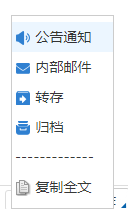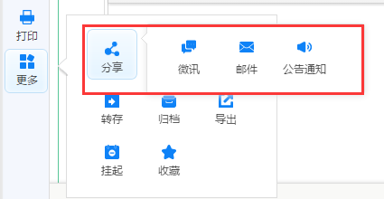 更多操作项设置:在表单打印界面或工作办理界面,我们可以选择将这份工作作为公告通知发布、作为内部邮件发送、转存到文件柜和网络硬盘或者归档,这个更多操作项设置限制了“更多操作”的浮动菜单选项,如图: