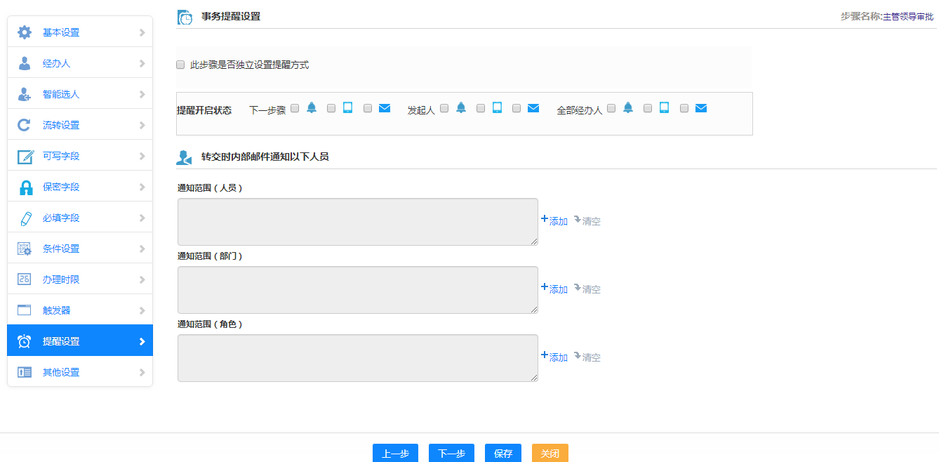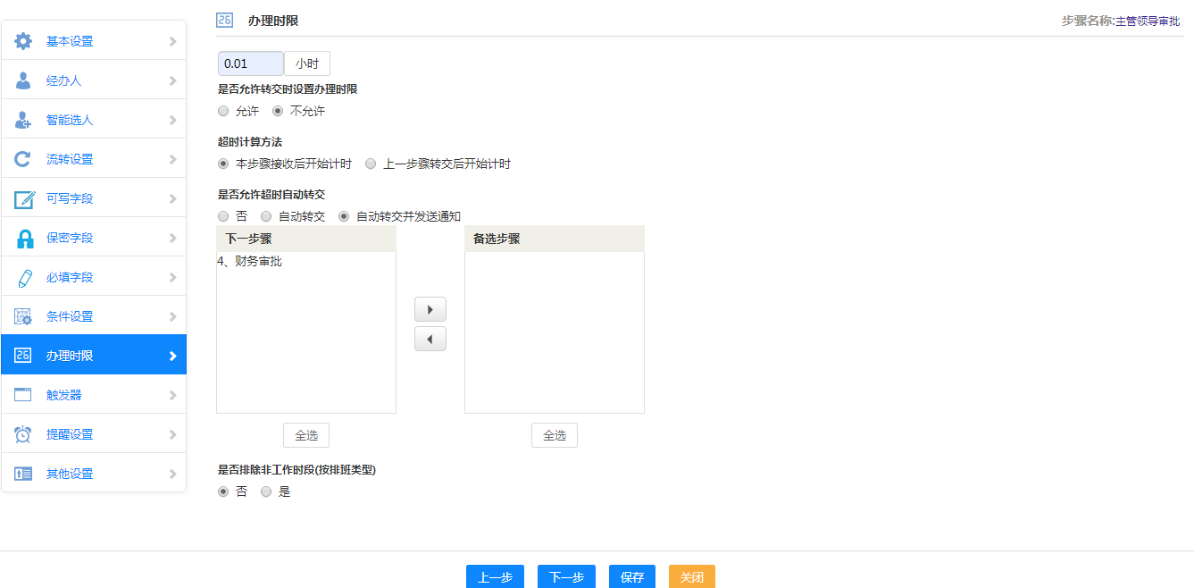 下一步骤:可以选择一个或多个分支步骤,如不选择,则系统按照顺序自动选择下一步骤。比如:步骤1的下一步骤设置为步骤3,则表示可以跳过步骤2直接流转至步骤3;也可以设置为多个分支,比如步骤1的下一步骤设为步骤2和步骤3,则表示流程的主办人可选择其中的一个流程分支,既可以是步骤2也可以是步骤3。下一个步骤的分支没有总数限制,如设置了[结束流程],表示可以在步骤转交时,直接结束流程。充分利用下一步骤的设置,用户就可以设计出复杂的业务流程,满足业务灵活多变的需要。