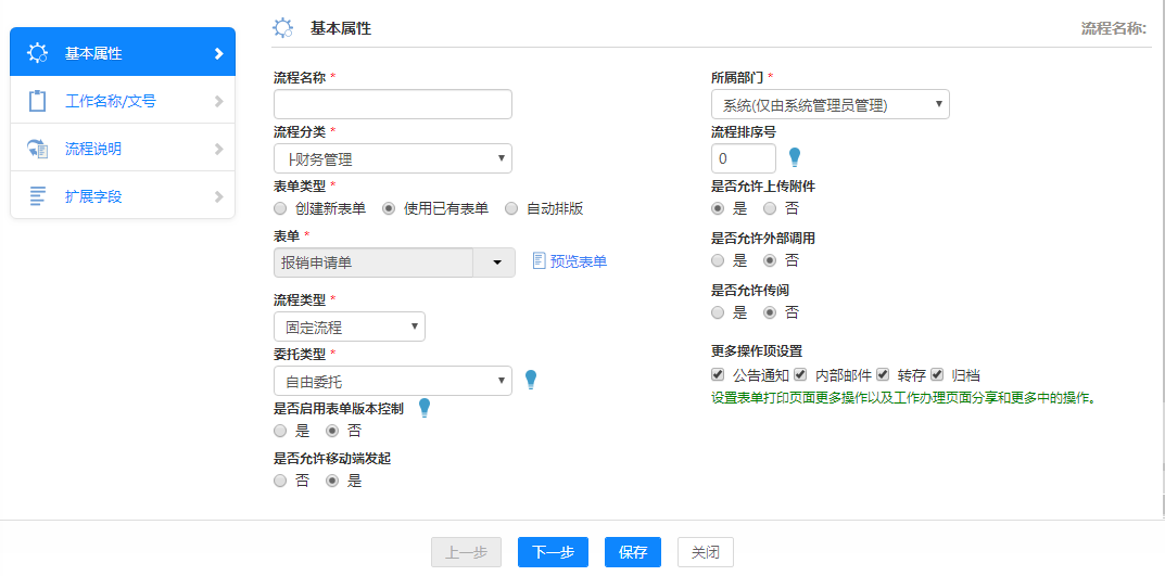 流程分类:对流程进行分类管理,便于流程的查找和修改。此处可选择的分类就是在【流程分类】里面设置好的。