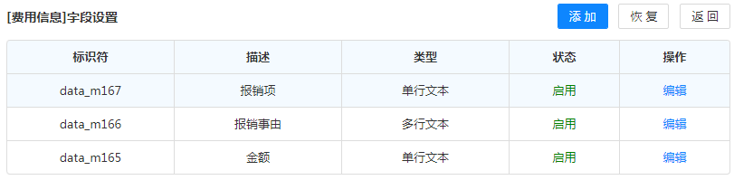 注: 1)新建的【报销信息】分组中添加了字段(控件),则无法对【申请信息】分组进行删除。如想删除,需将分组中的字段全部删除,则分组即可删除。删除的分组,在恢复中可以进行恢复或彻底销毁。 2)字段已生成数据,则无法对字段进行删除,只能停用