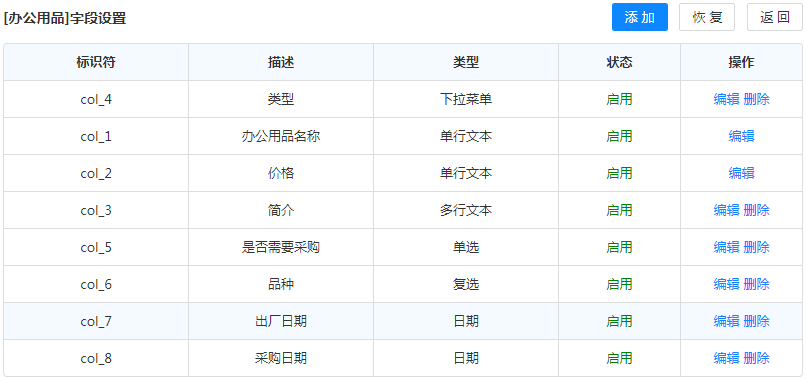 • 在【办公用品】分组中,创建所需的字段(列表项)。如下图所示:
