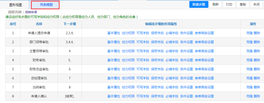 进入流程设置->设计流程->设计流程步骤界面,如下图所示: