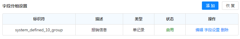 【报销信息】分组创建成功后,可以对分组字段进行编辑、删除、字段设置
