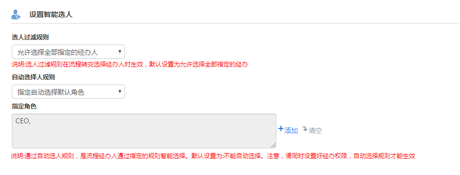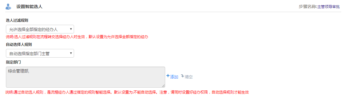 智能选人:父流程走向子流程步骤支持智能选人功能,和固定流程智能选人一样,在此不再详细说明。注:如果返回步骤中设置了人员,智能选人中又设置了人员,则会优先选择返回步骤中的人员。