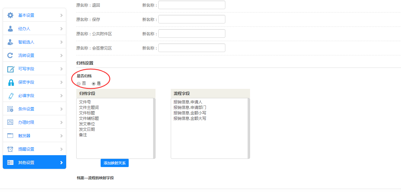 2)定义属性中的【归档】为总开关,在设计流程步骤->其他设置中的归档设置为分开关,两者缺一不可。在【其他设置】中【归档】默认是开启的,可以将字段中的数据映射到归档界面中,便于操作。