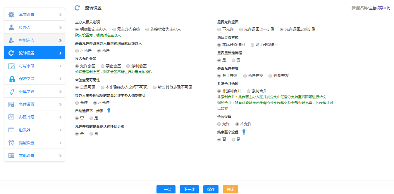 需要说明的一点:这里的传阅设置相当于总开关,流程步骤基本属性流转设置中的传阅设置相当于分开关,步骤开启后,传阅才生效,缺少任何一个都不能传阅。比如:流程基本属性中传阅人那勾选“允许传阅”,如果步骤2的传阅设置为允许,则步骤2在转交流程时就可以传阅;而步骤3的传阅设置如果没有设置为允许,则不能传阅。