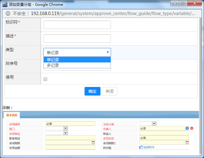 在添加该分组时需要设置好列表控件的表头项目。列表控件支持多种输入类型,包括单行输入框、多行输入框、下拉菜单、单选框、复选框、日期、日期+时间,满足用户多方面的需求;添加后的界面如下图所示:
