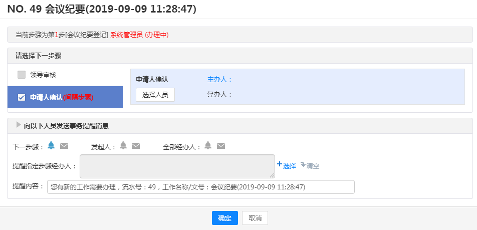 如:流程方向是[会议纪要登记]步骤转到[领导审核]步骤,[领导审核]步骤转到[申请人确认]步骤,不会考虑[领导审核]步骤有多少人办理,办理多少步骤,[领导审核]步骤办理过程类似自由流程,办结时转交到[申请人确认]步骤继续办理。