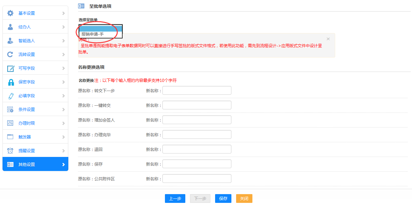 注:1)[2]代表设计步骤序号,是获取第二步骤的表单数据来生成工作名称/文号 2)获取的表单字段中必须是已有数据; 3)只有执行转交操作时生效。