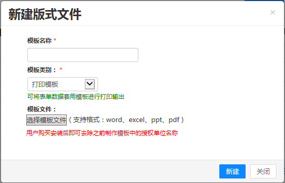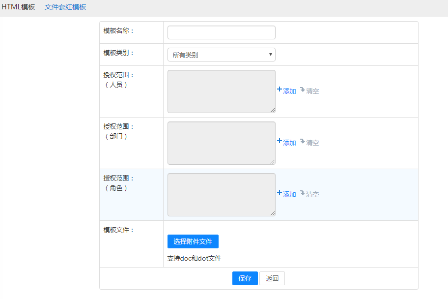 2. 上传:进入系统->行政办公设置->模板管理,选择“文件套红模板”,点击“上传模板”,填写授权使用范围,选择模板文件保存就可以了。