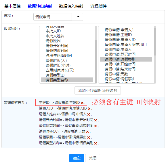 第二步,添加业务模块和流程之间的映射字段(数据转出映射),即是业务模块的字段映射到流程字段中。