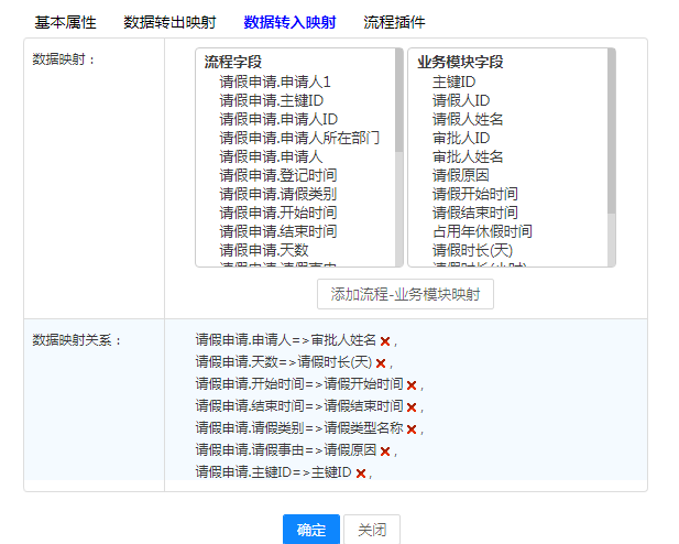 第三步,添加流程与业务模块之间的转入映射,即是更改了流程的字段对应业务模块的数据也发生变化。