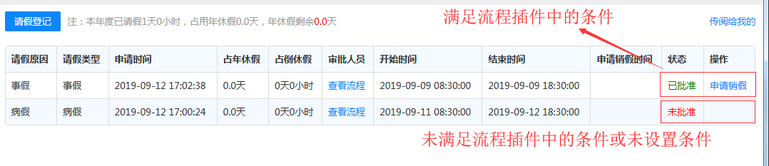 流程插件里设置的条件是作为审批是否通过的一个标准,比如上图的设置,审批结果字段为“同意”时,该申请被批准;如果流程走完了,表单字段不满足条件,那么这个申请就记录未批准。