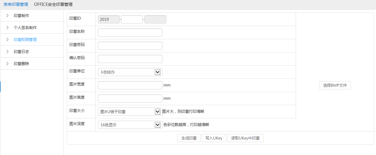 印章制作:填写印章的基本信息,选择bmp文件点击【生成】印章即可。制作好的印章存储在数据库中,印章来源设置为“数据库”后,就可以在表单上使用制作好的印章了,另外,在个人事务控制面板可以修改自己有使用权限的印章密码。