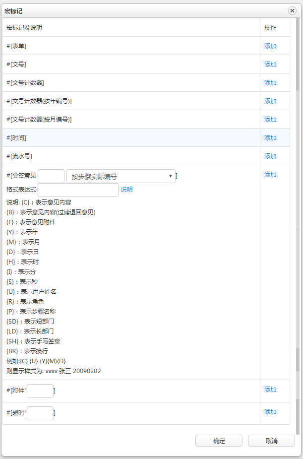 {F}表示流程名 {FS}表示流程分类名称 {U}表示用户姓名