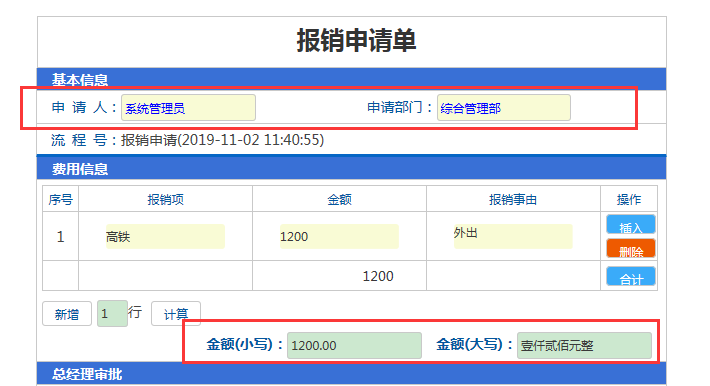 插入书签 现在新建一份工作填写基本数据(申请人、申请部门、金额小写、金额大写),如图: