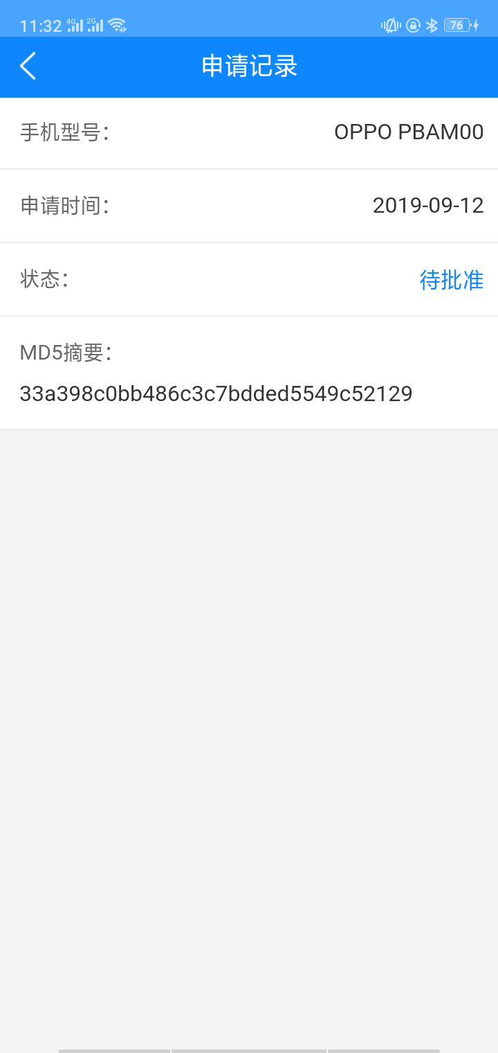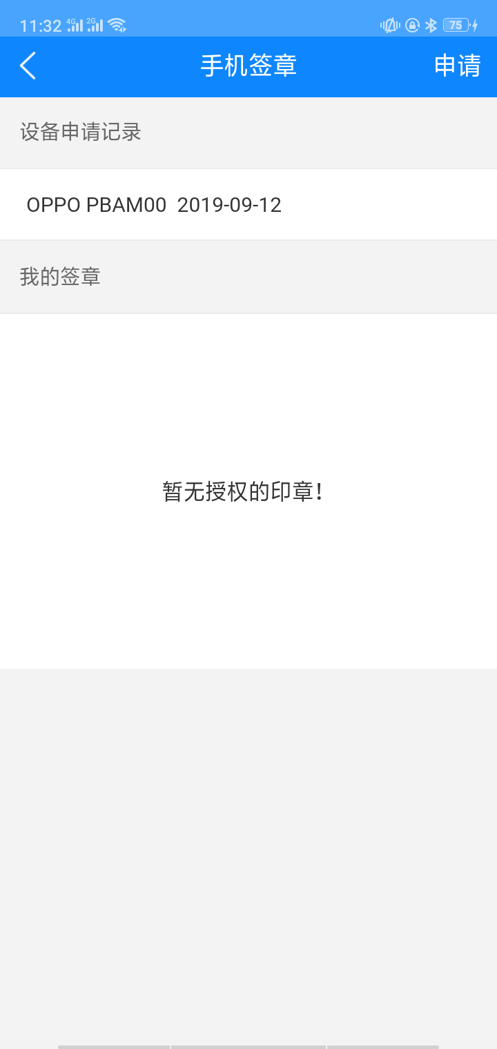 进入手机签章设置后,点击右侧【申请】按钮进行设备授权申请(此操作必须在设备上进行),申请记录会在下方列表中显示,点击每条记录可查看详情。