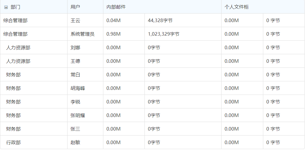 用户资源占用功能能够查询能看到部门的所有人在内部邮件和个人文件柜中占用的资源占用情况,并以列表方式显示。