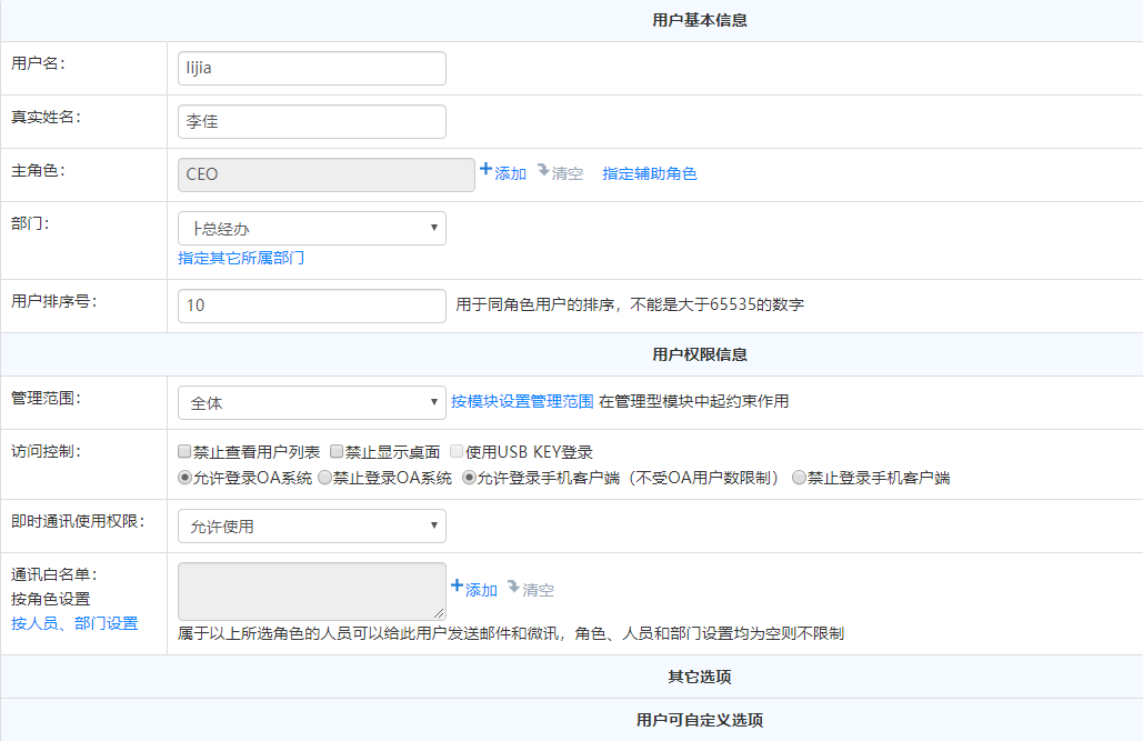 在这里需要注意用户名一旦建立后,是不可修改的。每个人的角色由主角色和辅助角色组成。主角色代表了该用户在OA系统中的真实角色,有关角色排序的权限由主角色体现。用户登录OA所能看到的模块权限是主角色和多个辅助角色的权限合集。如此便于对一个用户定义多个基本的权限的角色组合,更加灵活。