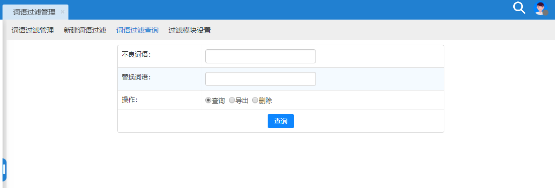 词语过滤查询:词语过滤查询中,可以查询、导出或者删除指定的不良词语。