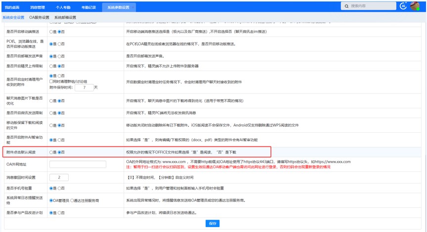 在系统管理的参数设置中新增“附件点击默认阅读”配置选项。当设置为“是”时,用户点击Office等附件将默认在线打开阅读;设置为“否”时,则直接执行下载操作。该功能仅在用户具备相应文件权限时生效。
