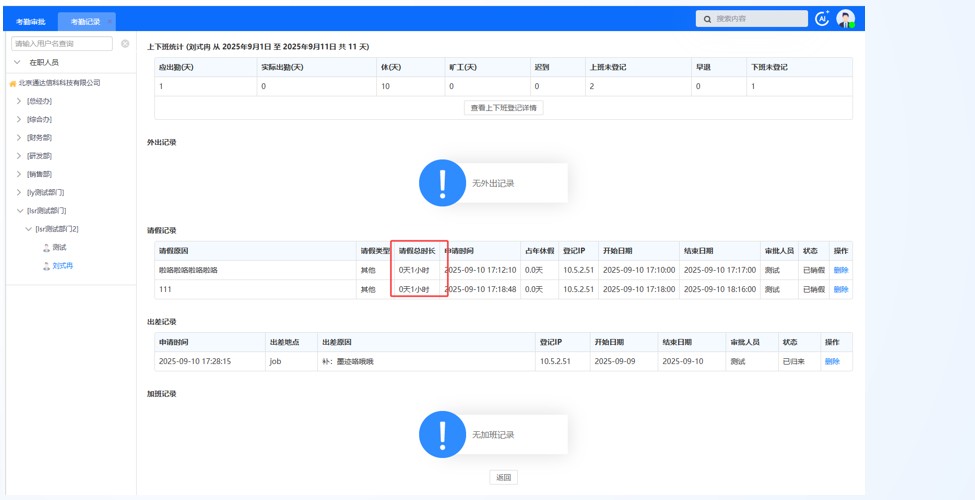 ①「请假登记」环节,新增请假时长自动计算与展示功能。您提交的每一笔申请都会清晰显示具体天数/小时,让假期使用明明白白。