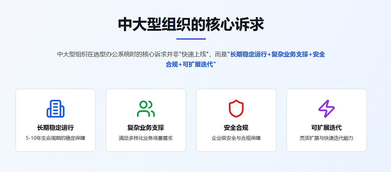 对于中大型组织而言,办公系统的选型重点已超越短期的“快速上线”,转而追求支撑长远发展的核心价值:即系统的长期稳定运行、复杂业务的高效支撑、严格的安全合规保障以及可持续的扩展迭代能力。