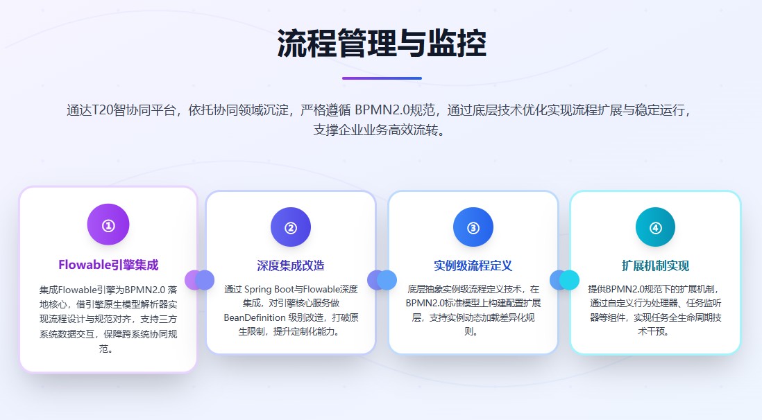 通达T20智协同平台,依托协同领域沉淀,严格遵循 BPMN2.0规范,通过底层技术优化实现流程扩展与稳定运行,支撑企业业务高效流转。