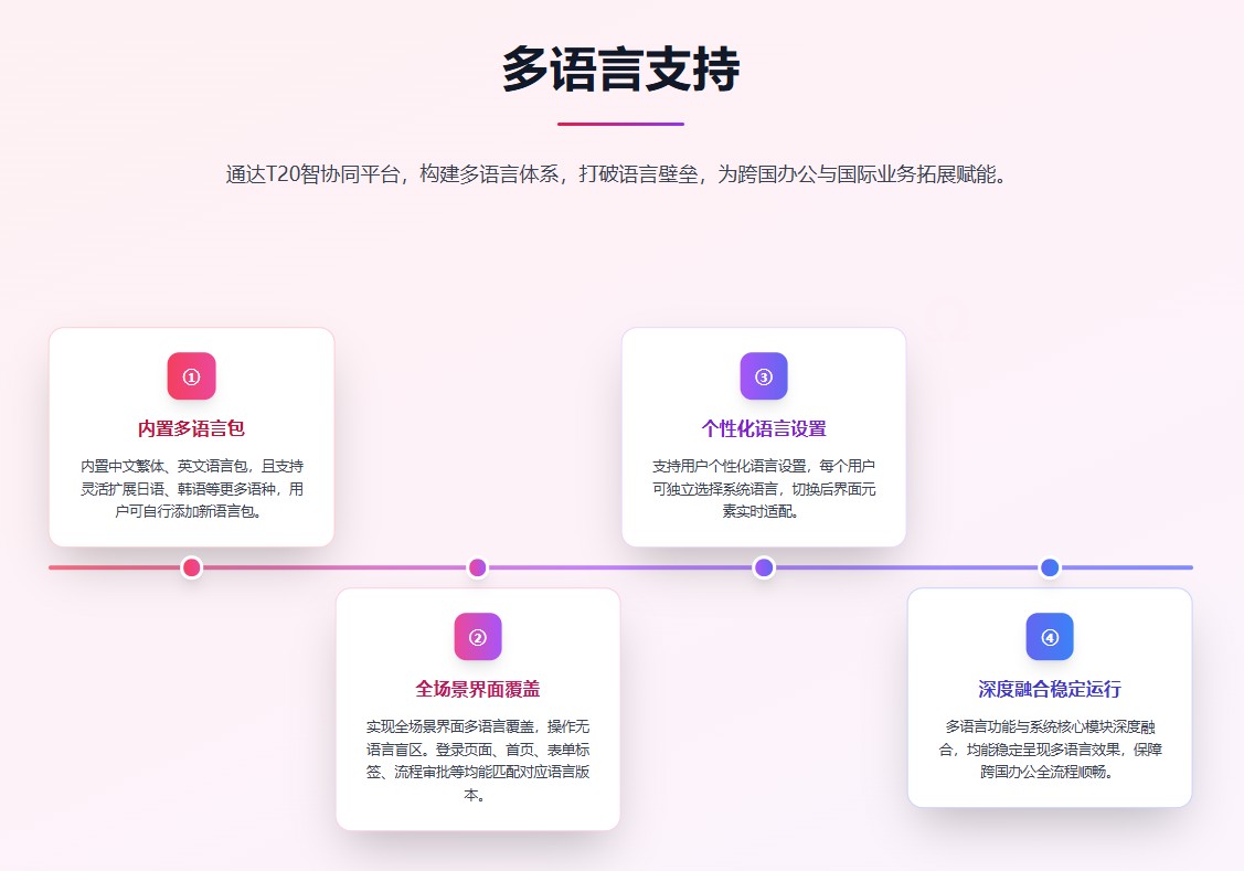 通达T20智协同平台构建了完善的多语言体系,打破跨国协作的语言壁垒,为组织跨国办公、拓展国际业务、实现全球团队无缝协作提供坚实基础。