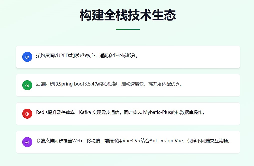 ② 具备成熟的技术生态,全面支持微服务架构、高并发场景与多端一体化开发。