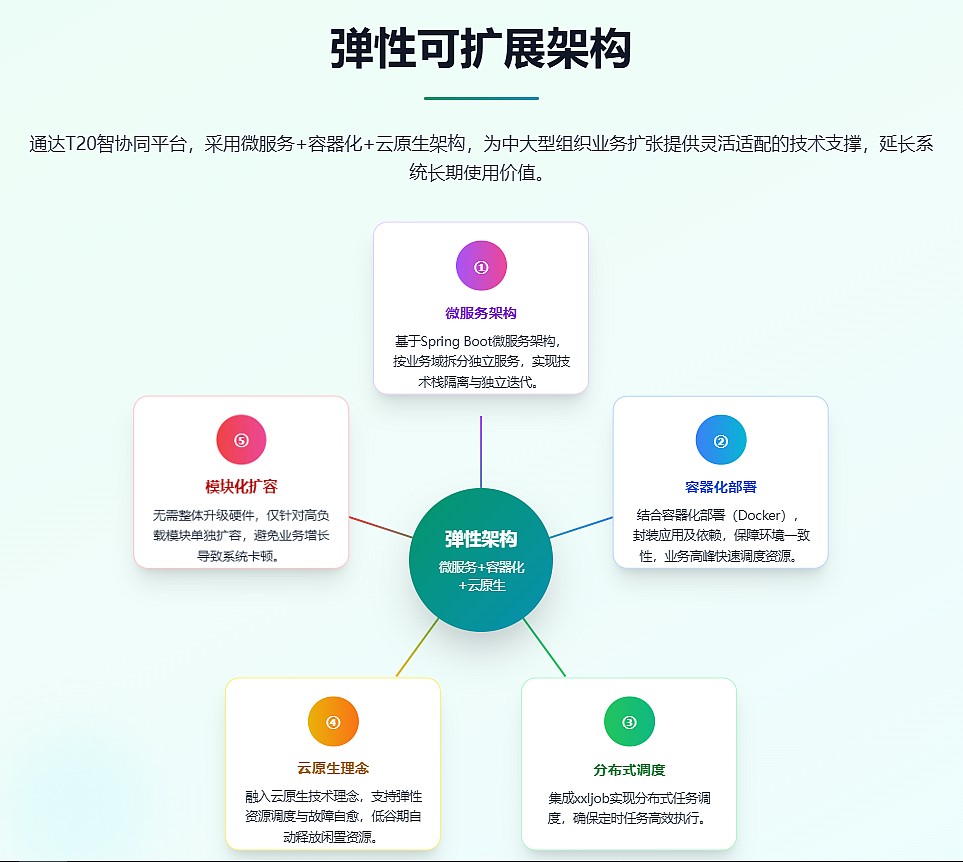 通达T20智协同平台采用微服务+容器化+云原生架构,具备弹性扩展能力,可灵活适配中大型组织的业务扩张需求,保障系统平滑演进,延长生命周期。