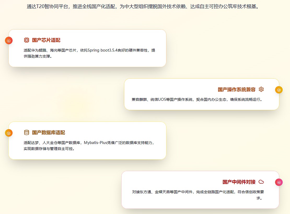 通达T20智协同平台全面构建自主可控的技术底座,助力中大型组织摆脱国外技术依赖,满足安全合规的硬性要求。