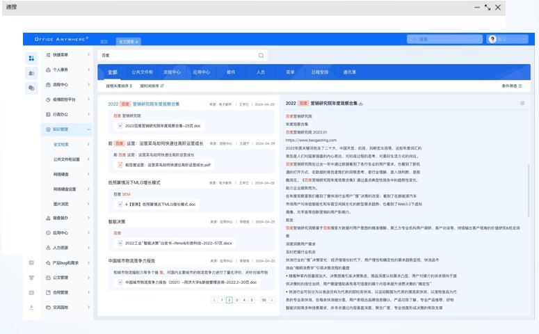通达“通搜”全文检索服务能够自动索引OA系统中的附件文件,支持关键字、高级搜索及自然语言搜索,并提供安全的预览与管理功能。它通过严格的权限控制,帮助用户高效、精准地检索和管理办公文档。
