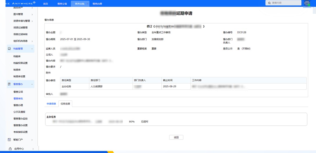 动态监控:实时跟踪任务进度,支持定时催办与超时预警,避免业务延误。