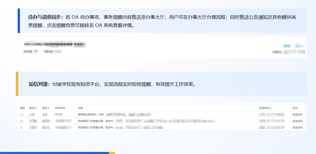 7.全渠道消息同步:将OA待办、提醒及公告实时推送至办事大厅与短信平台,用户可通过多渠道处理事务或跳转查看,实现业务高效协同与触达。