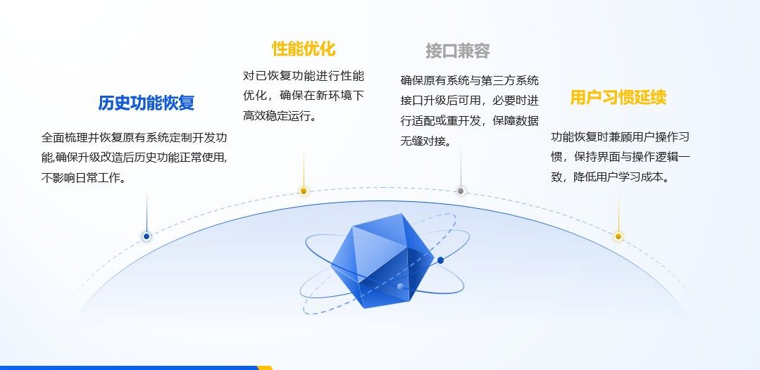 4.功能平滑过渡:全面恢复并优化原有定制功能,确保与第三方系统接口兼容,延续用户习惯,降低迁移成本。