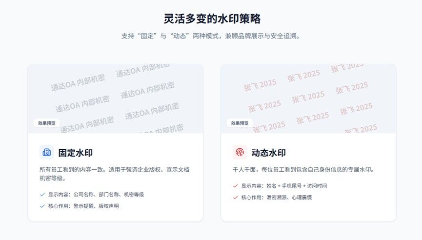 · 固定水印+动态水印:同样支持固定水印与动态水印设置,既可统一展示企业标识,也可根据用户身份动态显示个性化信息。