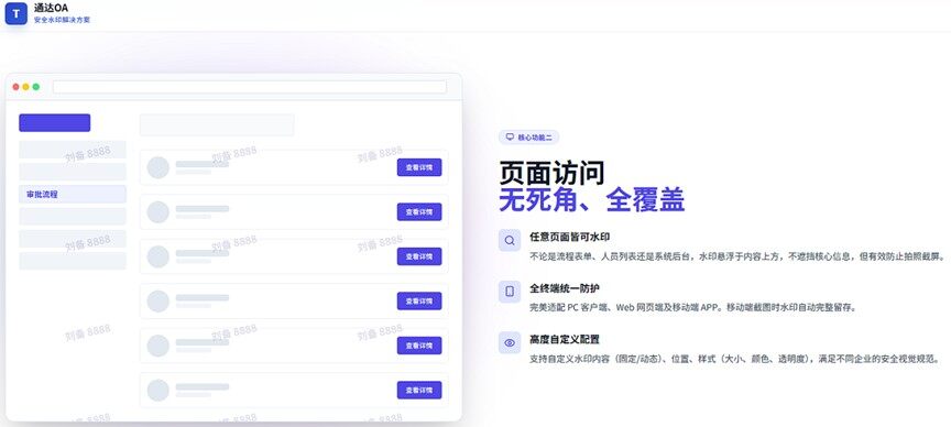 现在,通达OA聚焦实际安全痛点,推出“文档水印+页面水印”双轨防护方案,全面覆盖OA系统的所有终端、模块与场景,为组织数据构建坚实的安全屏障。