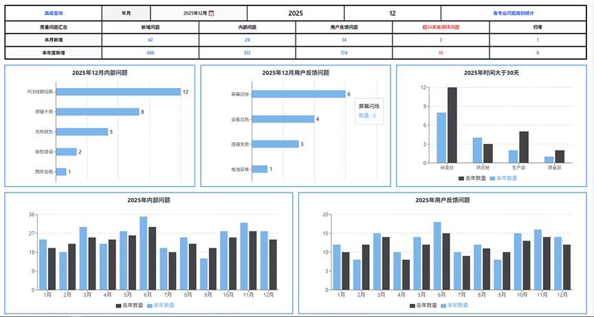 通达OA质量管控决策看板,可自动归集与整合分散在不同业务单据中的质量数据,通过全景式、多维度、可视化的方式集中呈现。它不仅清晰展示质量问题汇总、多渠道反馈数量与问题归零趋势、用户反馈变化曲线等信息,还支持数据穿透分析与跟踪闭环,帮助企业实现对产品质量的全面、精准管控。