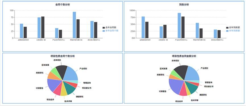 通达OA合同全景分析看板,可根据组织业务特点定制专属视图,将分散数据转化为结构化的全景看板。支持多维度对比分析,可视化呈现各部门合同额、合同数量、到款情况,以及不同项目的金额分布,真正实现合同数据的全局洞察。