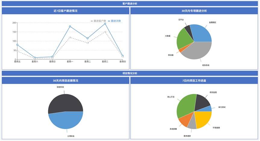 通达OA经营管理数据看板,通过低代码方式快速构建,实现业务与项目数据的一体化呈现。管理者可直观掌握经营全貌,实时查看销售外出统计、客户跟进动态、项目进展状态、问题处理进度等重要信息。